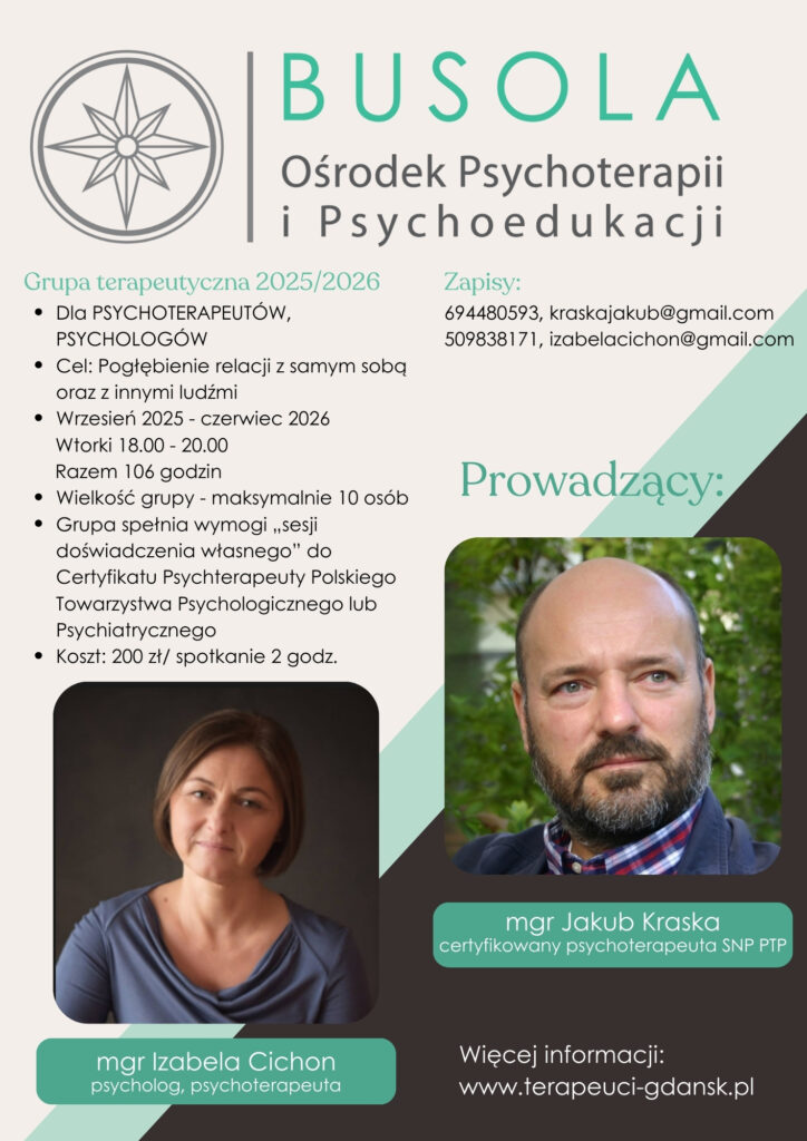 Prowadzący: Izabela Cichon – psycholog, psychoterapeuta, Jakub Kraska – certyfikowany psychoterapeuta SNP PTP